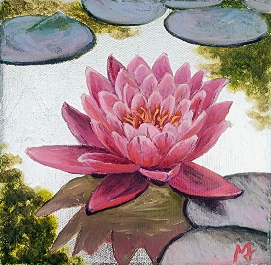 This mini print is mounted on wood panel with bronze painted sides. easy to hang or display on a shelf. The original painting is from my Solarium collection.