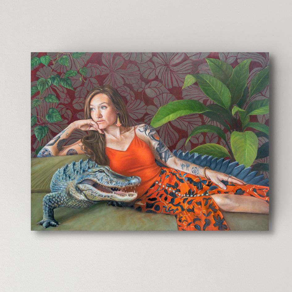 I originally photographed this model for a different painting but a different image kept appearing to me. Sometimes paintings happen that way. So after a few months, we went back and tried again with this reclining pose. I wanted this work to convey the lushness, the absurdity and the complexity of life. The alligator is symbolic in his presence, and so is the trumpet flower in her ear.